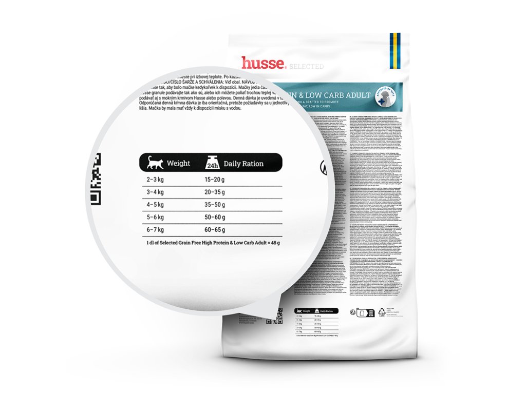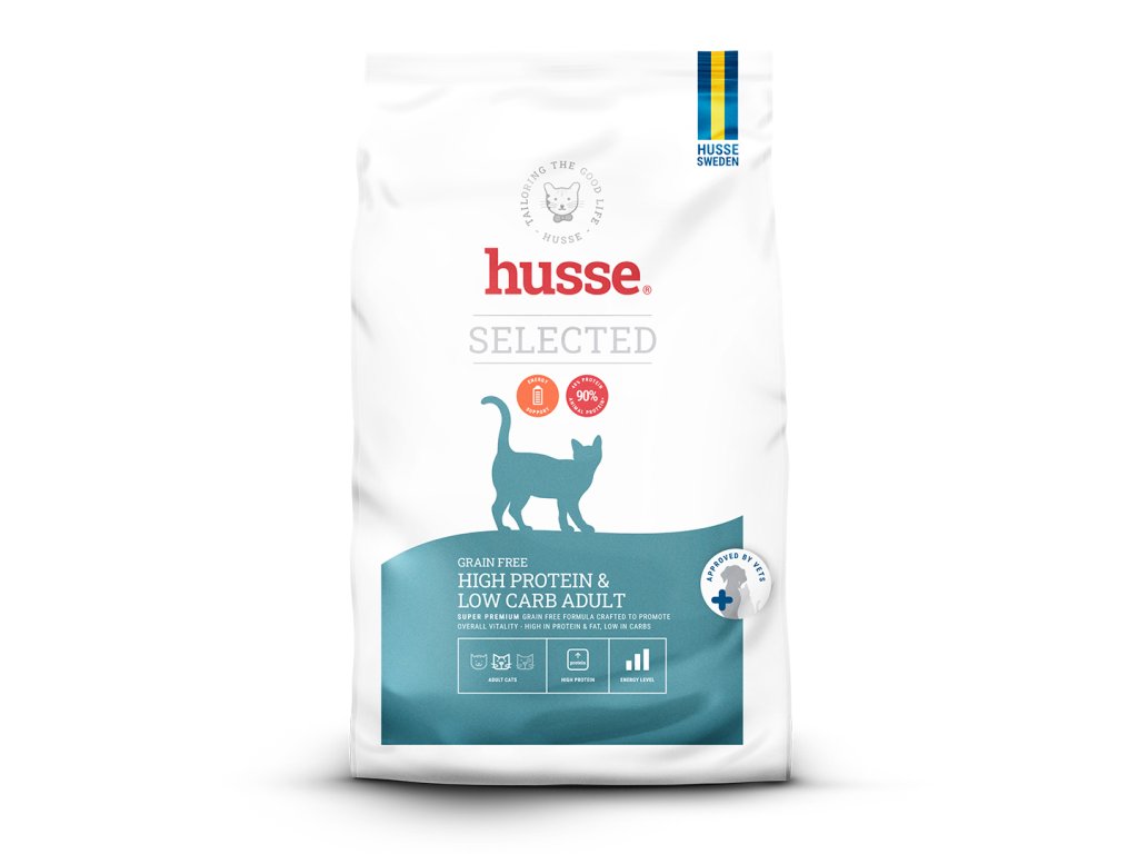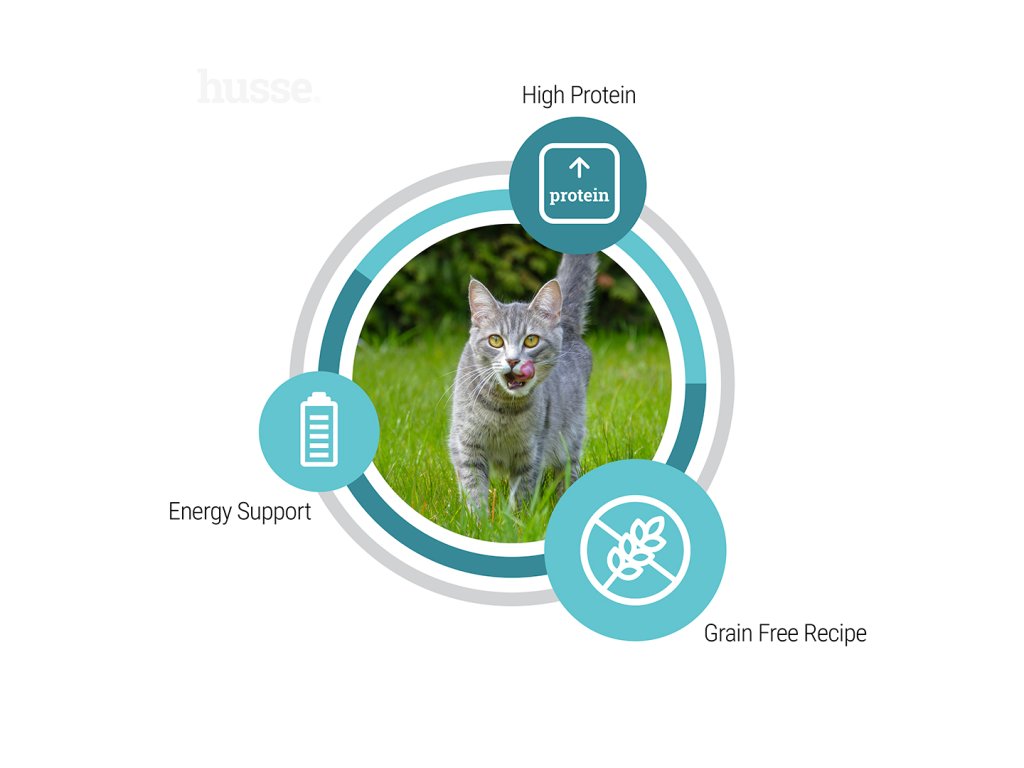 Husse Grain Free High Protein & Low Carb Adult je kompletní superprémiové suché krmivo vytvořené speciálně pro aktivní dospělé kočky, které vyžadují vysokou energetickou hodnotu a kvalitní živočišné bílkoviny.Receptura poskytuje 90 % všech bílkovin ze živočišných zdrojů, což dokonale odpovídá přirozeným potřebám masožravců. Vysoký obsah proteinů a tuků v kombinaci s nízkým podílem sacharidů podporuje:Krmivo je obohaceno o taurin (pro srdce a zrak), L-karnitin (pro spalování tuků a vitalitu) a prebiotika, která napomáhají zdravému trávení a celkové pohodě. Ideální volba pro kočky, které milují pohyb, lov, hru a aktivní životní styl.