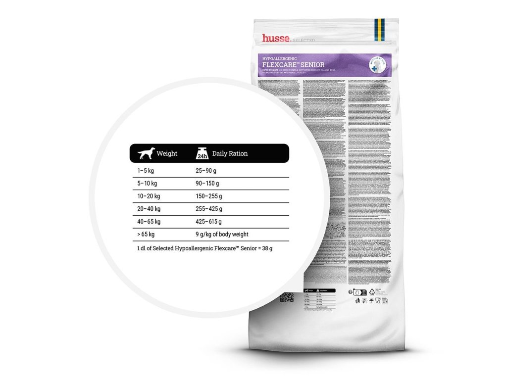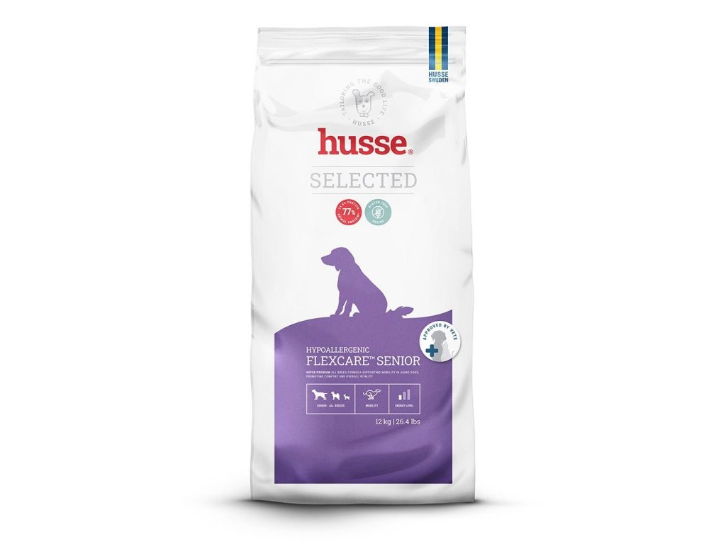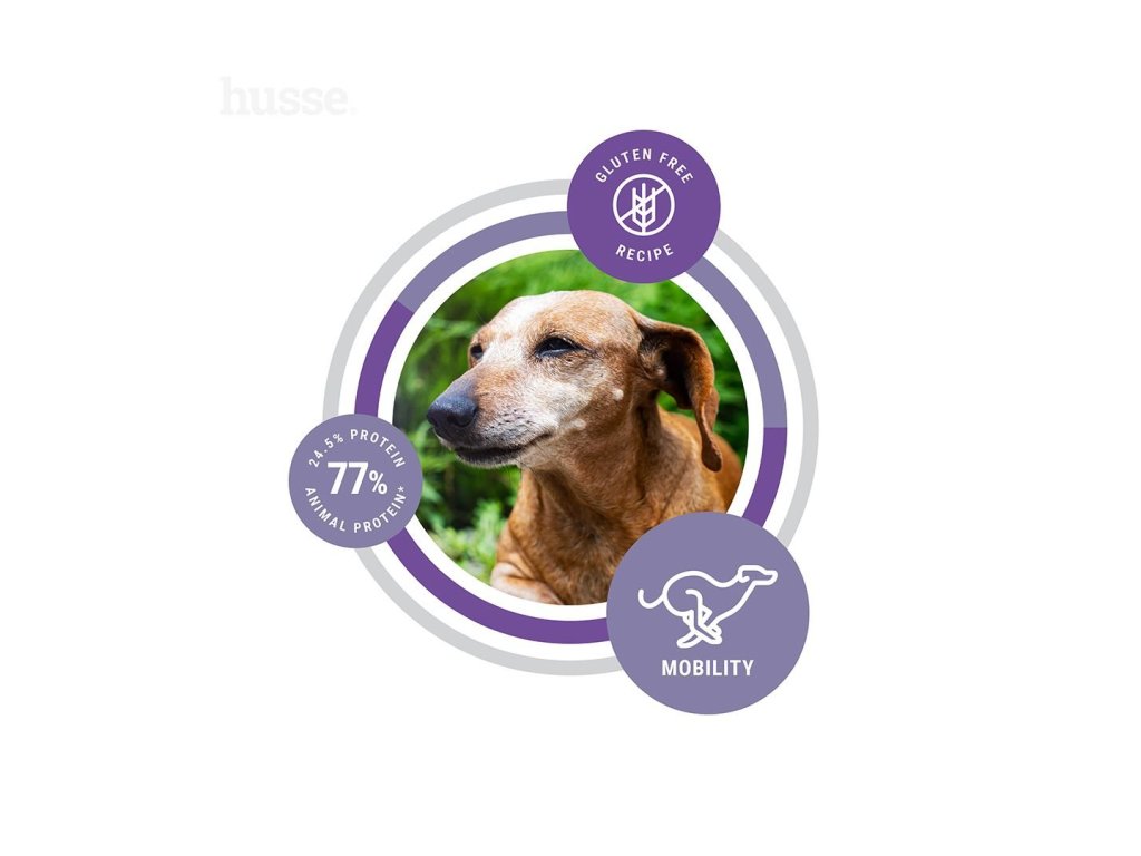 Hypoalergenní a vysoce stravitelné suché krmivo vyrobené z prvotřídních surovin, které pomáhá udržovat i zlepšovat pohyblivost kloubů. Obohaceno o směs Husse Flexcare™, která podporuje aktivní pohyb a pohodlí vašeho psa po celý seniorsky věk.